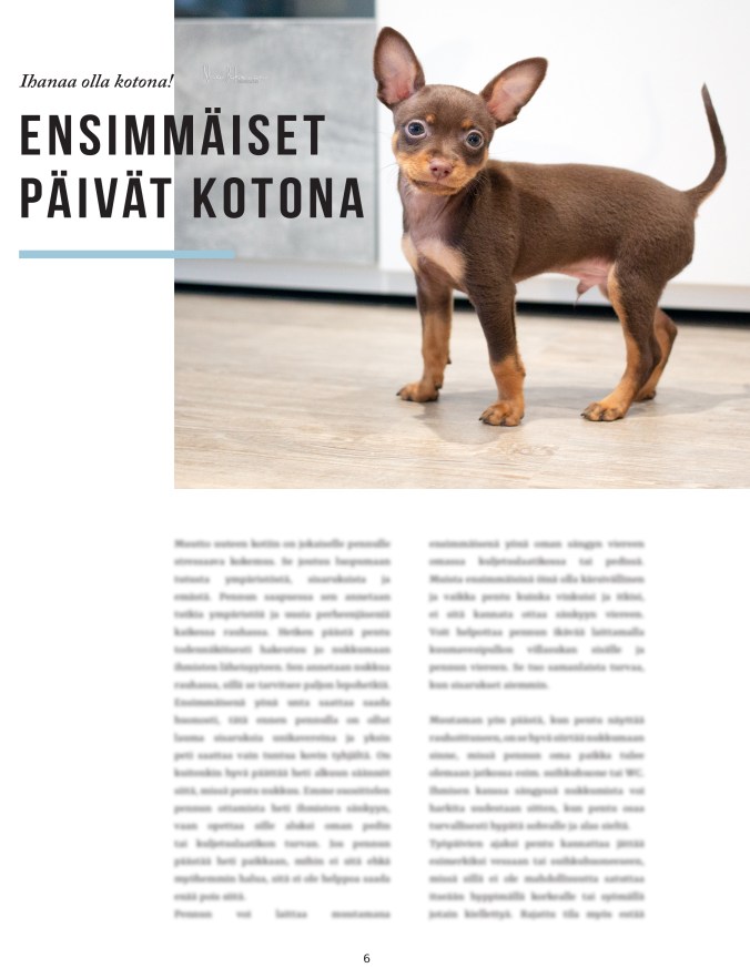 Meillä pennut tottuvat kodin arkisiin ääniin, erilaisiin ihmisiin ja muihin koiriin, autoilla matkustamiseen, sekä ulkoiluun heti kun se on mahdollista. Panostamme erityisesti sisäsiisteyskoulutukseen ja pentumme osaavatkin luovutusiässä tehdä kaikki tarpeensa sekä ulos että alustalle. Syötämme pennuille laadukkaan nappulan lisäksi myös raakaruokaa. Pentumme sirutetaan, terveystarkastetaan, sekä rekisteröidään Suomen Kennelliittoon ennen luovutusta.