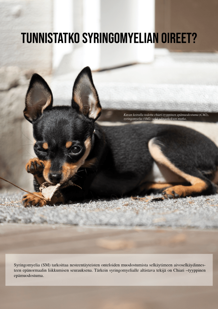 Kaikilla videon koirilla on diagnosoitu syringomyelia (SM2) sekä Chiari-tyyppinen epämuodostuma (CM2).