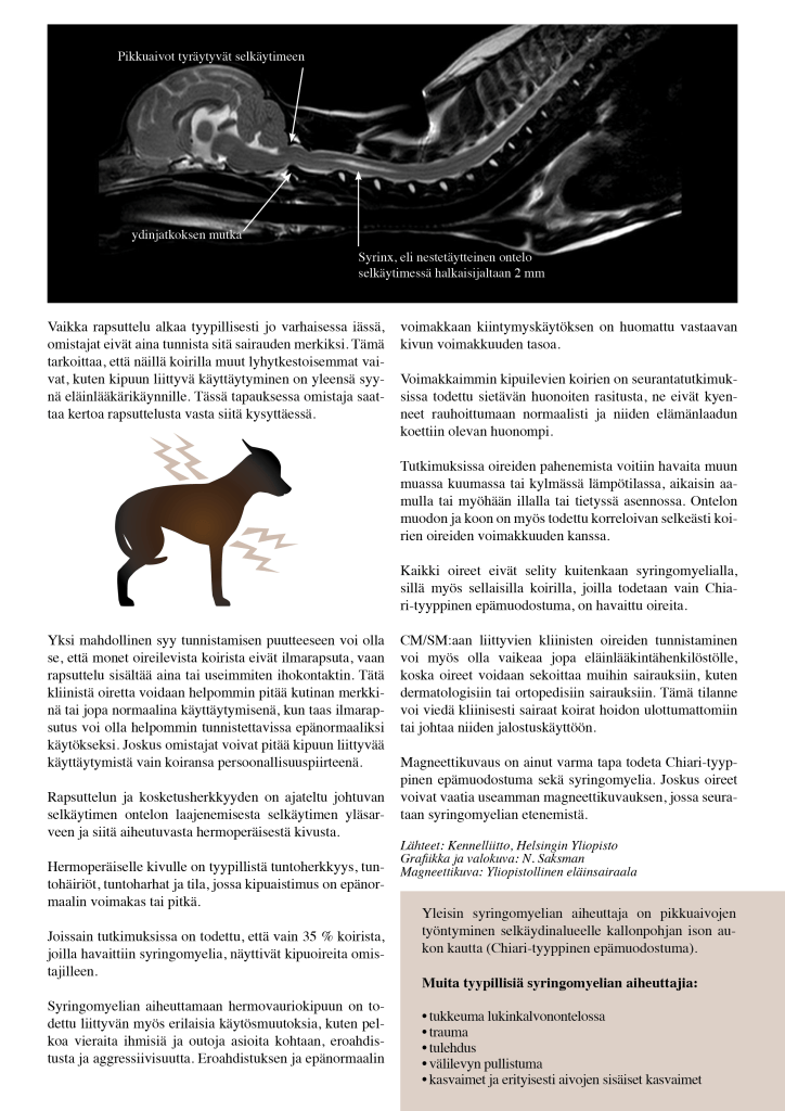 Oman kennelimme koiria (kasvattejamme, sijoituskoiria, tuonteja) on nyt magneettikuvattu 12 ja jokaisella on löytynyt joko Chiari-tyyppinen epämuodostuma tai myös syringomyelia. Koiriemme magneettikuvaamattomia lähisukulaisia on jalostuksessa ympäri Suomea ja monissa tapauksissa myös ulkomailla. Vaikka olemme olleet asiasta avoimia ja rohkaisseet kasvattajia kuvauttamaan jalostuskoiriaan, ei näin ole kuitenkaan tapahtunut. Rodussa tehdään pentuja jopa syringomyeliaa sairastavan koiran tutkimattomilla jälkeläisillä. Eläinlääkäri Kiviranta kertoi webinaarissa, että syringomyeliaa sairastavan koiran jälkeläisillä on kolme kertaa isompi mahdollisuus sairastua kuin sellaisen koiran, jonka vanhemmalla ei ole syringomyeliaa.