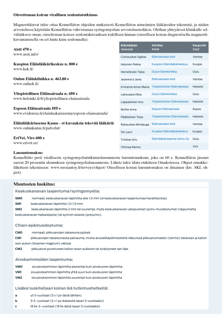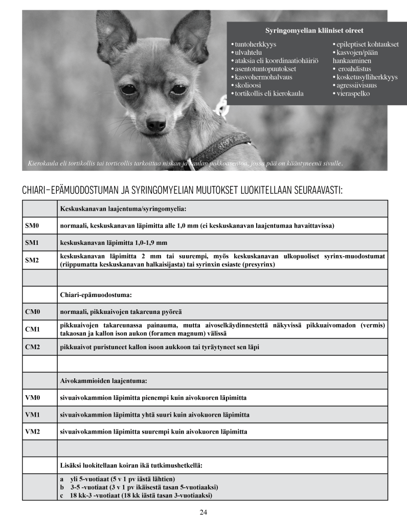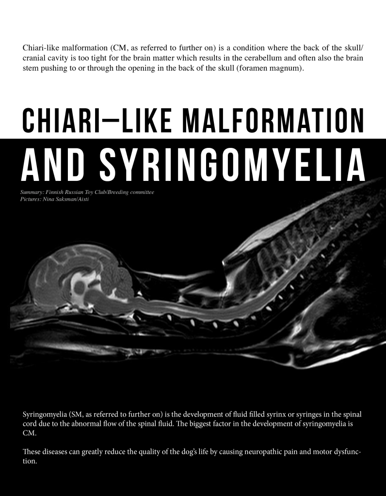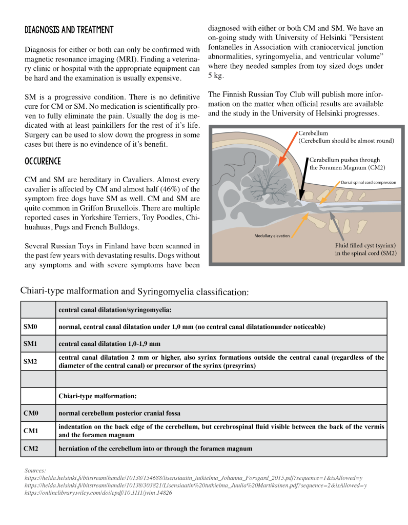 Aivokammioiden laajentuma: VM0 sivuaivokammion läpimitta pienempi kuin aivokuoren läpimitta VM1 sivuaivokammion läpimitta yhtä suuri kuin aivokuoren läpimitta VM2 sivuaivokammion läpimitta suurempi kuin aivokuoren läpimitta Neurologien kanssa käytyjen lukuisien keskustelujen perusteella Chiari-tyyppistä epämuodostumaa aiheuttaa rotumme kääpiökasvuisuus. Kuono pituudella ei tässä ole merkitystä, vaan kallon muoto on enemmänkin se syy, miksi aivot eivät mahdu kalloon. Aivot eivät yksinkertaisesti enää jossain vaiheessa pysty kutistumaan enempää. Ollessamme rotuyhdistyksen hallituksessa sekä myöhemmin jalostustoimikunnassa, jaoimme kattavasti tietoa syringomyeliasta, järjestimme webinaarin neurologi Kivirannan (ELL, Dipl ECVN) kanssa ja toivoimme, että kasvattajat lähtisivät mukaan selvittämään kuinka paljon sairastapauksia rodussamme on, sillä vain yhden tai kahden kasvattajan avoin koirien magneettikuvantaminen ei riitä kartoittamaan kokonaistilannetta. Valitettavasti näin ei käynyt ainakaan siinä laajuudessa kun toivoimme. Terveysongelmista puhuminen sen sijaan johti runsaaseen negatiiviseen palautteeseen, painostamiseen ja jopa uhkailuun, mikä loppujen lopuksi johti siihen, ettemme enää voineet jatkaa yhdistyksen toimihenkilöinä.