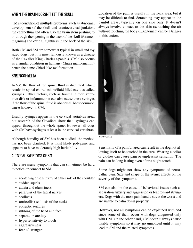Syringomyeliasta kuulin puhuttavan rodulla ensimmäisen kerran vuonna 2009 tai 2010. En itse tiennyt mistä sairaudesta oli kyse, sillä tietoa oli hyvin paljon vaikeampi saada tuohon aikaan. Tiesin kyseessä olevan cavalier kingcharlesinspanieleille tyypillinen sairaus mutta en sen enempää. Yhden yksilön sairastuminen kuulosti huonolta tuurilta.