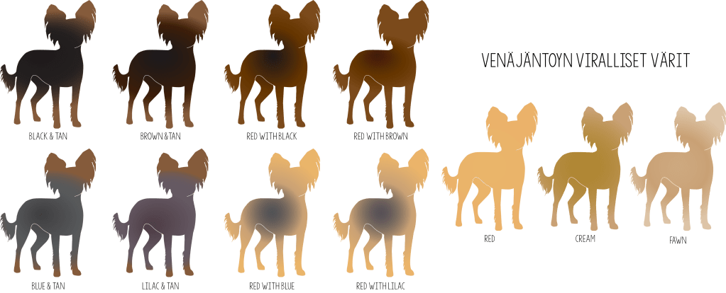 Värit englanninkielisessä rotumääritelmässä: Black and tan; brown and tan; blue and tan; lilac and tan; red with black, red with blue; red with brown, red with lilac; red; fawn; cream. The colour of the nose matches the main hair colour.